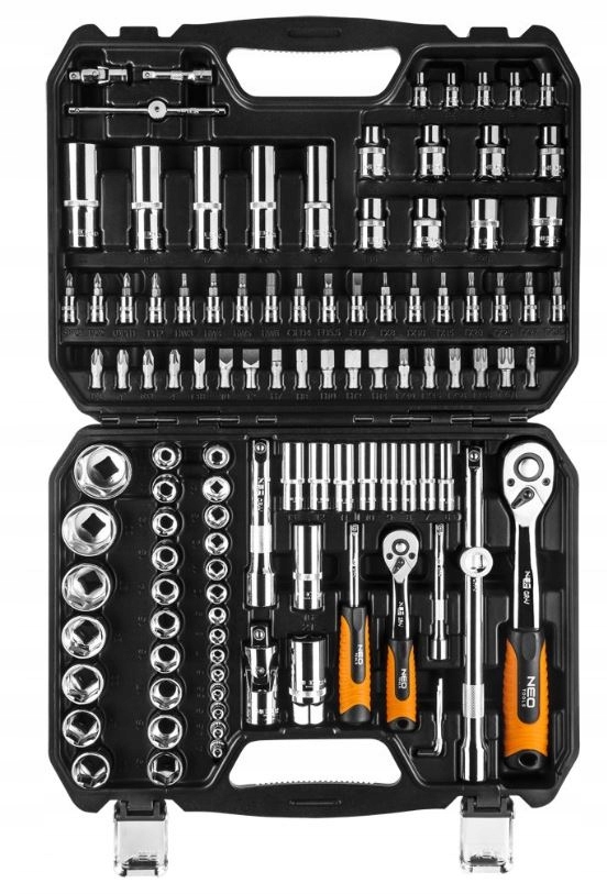 Набір торцевих ключів NEO на 1/2" і 1/4" (арт. 08-666) складається з 110 деталей, виготовлених із високоякісної хромо-ванадієвої сталі. До набору входять тріскачки 1/2" і 1/4" (надійний храповий механізм — 72 зубці) з вигнутими ергономічними ручками. До набору входить багате паковання шестигранних головок двох довжин із рельєфними написами (розмірами від 4 до 32 мм), головок Torx (E4 — E24) і викруткових біт (плоскі, хрестові, шестигранні, Torx). Все це доповнюється широким асортиментом аксесуарів. Вертикальне розміщення елементів у валізі дає змогу швидше зібрати необхідний комплект. Ключі постачаються в практичному та міцному пластиковому футлярі з металевими засувками та зручною ручкою. Бренд NEO виправдовує очікування професіоналів.